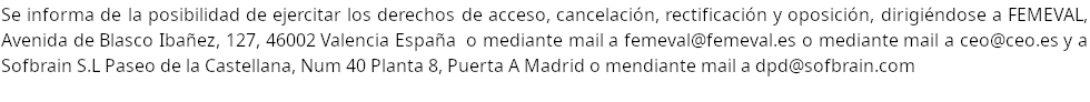 En Sofbrain S.L. y FEMEVAL tratamos la información que nos facilita con el fin de prestarles el servicio solicitado y realizar la facturación del mismo. Los datos proporcionados se conservarán mientras se mantenga la relación comercial o durante los años necesarios para cumplir con las obligaciones legales. Los datos no se cederán a terceros salvo en los casos en que exista una obligación legal. Usted tiene derecho a obtener confirmación sobre si en Sofbrain S.L. o FEMEVAL estamos tratando sus datos personales por tanto tiene derecho a acceder a sus datos personales, rectificar los datos inexactos o solicitar su supresión cuando los datos ya no sean necesarios.